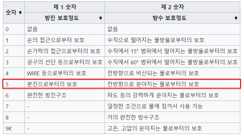 IP 55 여서 제품 사용 중에 땀을 어느 정도 흘려도 별문제 없이 잘 쓰고 있습니다. (아래 사진 클릭 시 IP등급 위키백과로 이동됨)