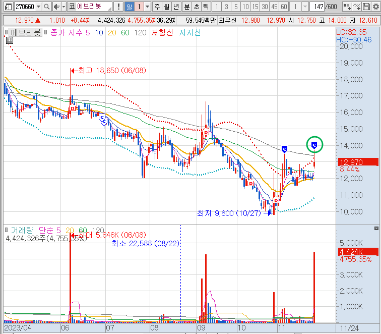 오늘 (23.11.24) 급등 (고가 +17.06%)한 종목, 에브리봇을 1번째 수익 실현(11.06) 이후 18일 만에 또다시 수익 실현에 성공했습니다.