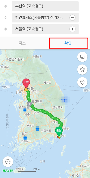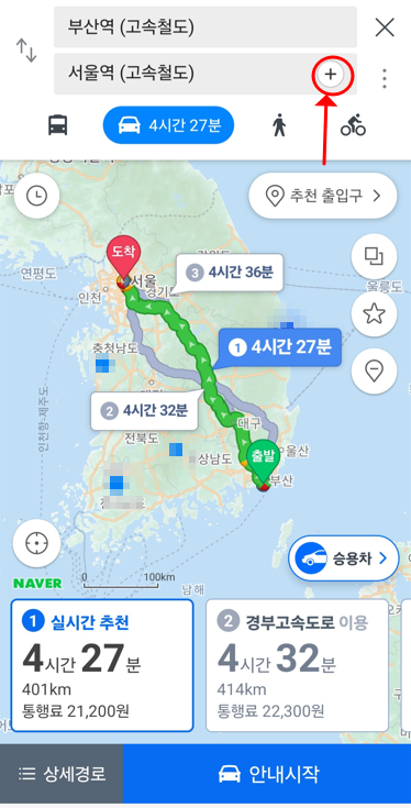 1.1. 아래 그림 1과 같이 출발지(예.부산역)와 도착지(예. 서울역)를 넣은 상태에서