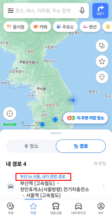 처음 나오는 화면 아래에서 경로를 선택하면 방금 저장한 경로가 맨 위에 있음을 확인할 수 있습니다.