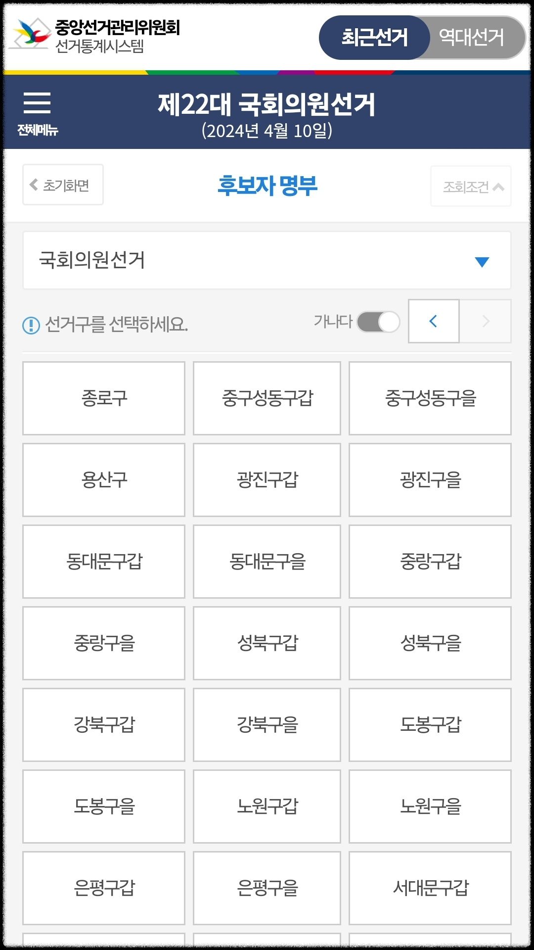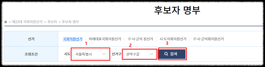 아래 녹색 버튼이나 그림4~6을 터치해서 중앙선거관리위원회 홈페이지에서 조회해 보시면 됩니다.