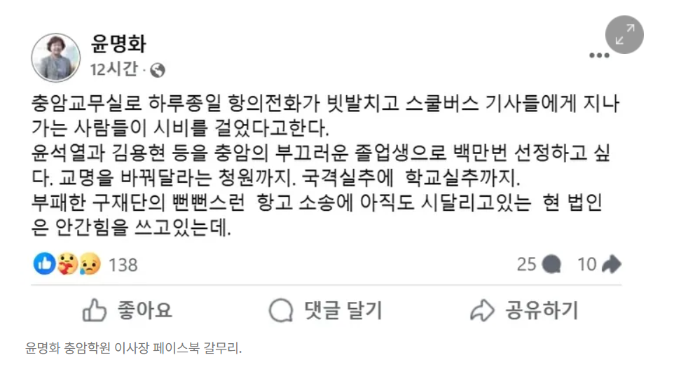 충암고 교장 이윤찬 선생님 왈 "충암고 교직원들 모두 성난 시민들과 다를 바 없다. 학부모님들도 당연히 그렇다. 충암고 학생들조차 굉장히 부끄러워하고 있다."