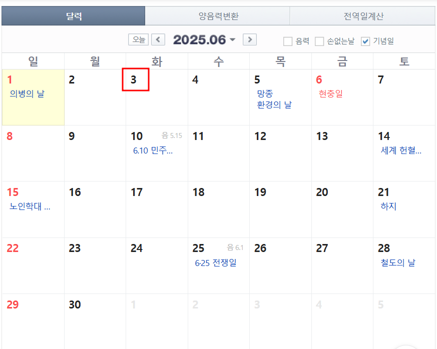 2025년 6월 달력을 보면 6월 2일에 휴가 쓰면 5월 31일부터 6월 3일까지 4일 동안 회사를 쉴 수 있습니다.