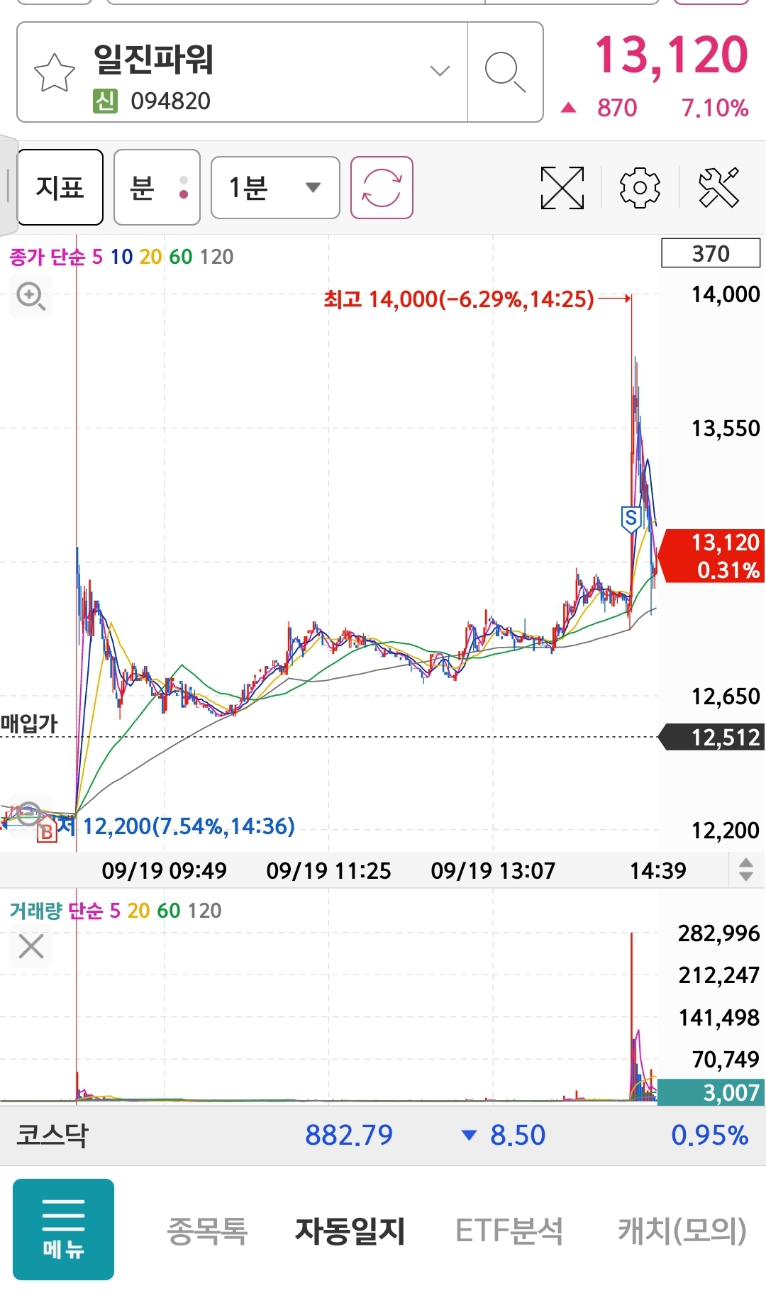 오늘(9월 19일) 어제 산 가격 대비 7.7% 상승한 가격인 12,250원에 어제 산 물량 다 매도함.