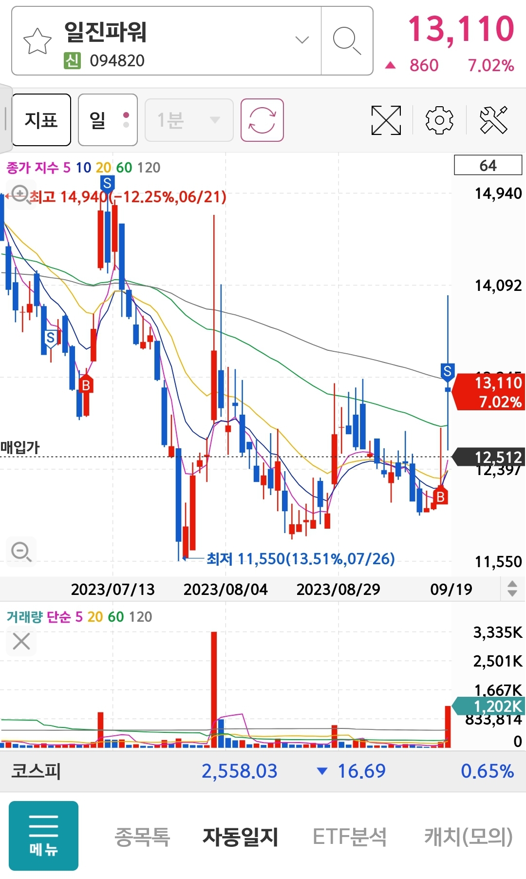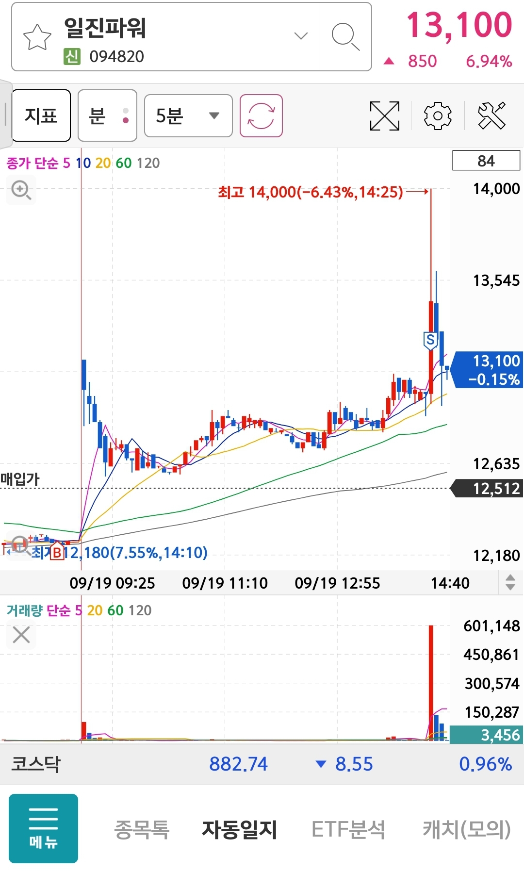 어제(9월 18일) 일진파워를 13,190원에 사고